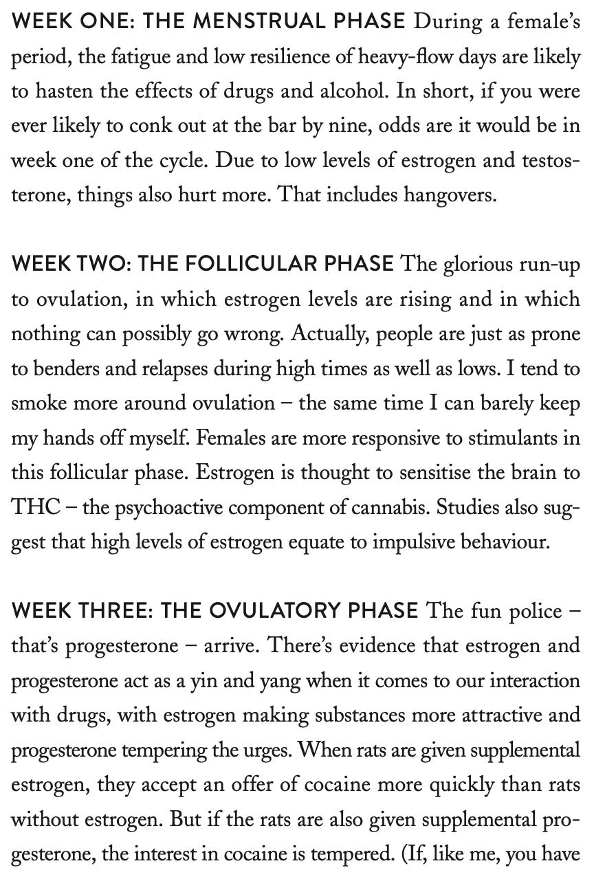 Two. Where you are in your cycle also impacts the way in which drugs affect you. This is from my book, Woman of Substances: