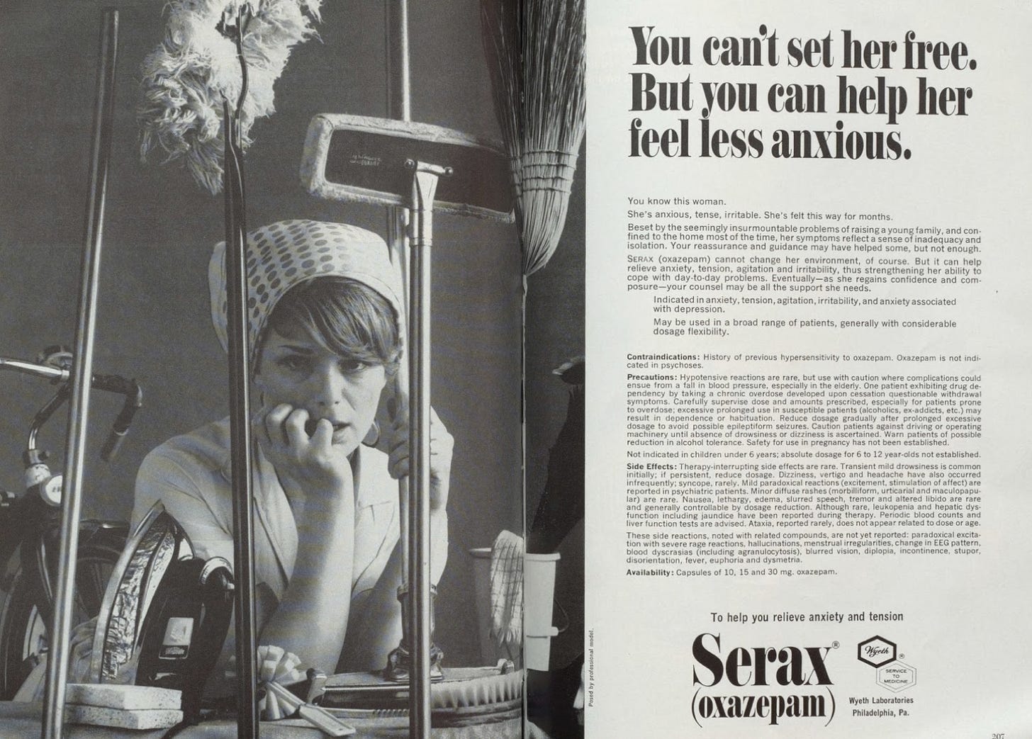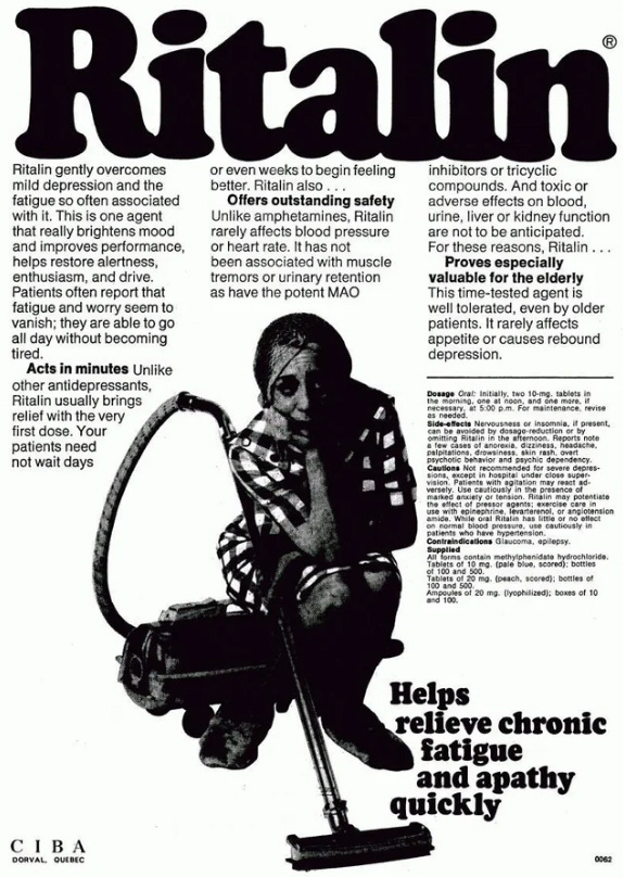 Just as ‘hysteria’ was the catch-all condition for frustrated women in Freud’s day, ‘anxiety’ was the buzzword from the mid-twentieth century onwards. Going by these adverts for Serax and Ritalin, the best prescription would have been a more fulfilling life.